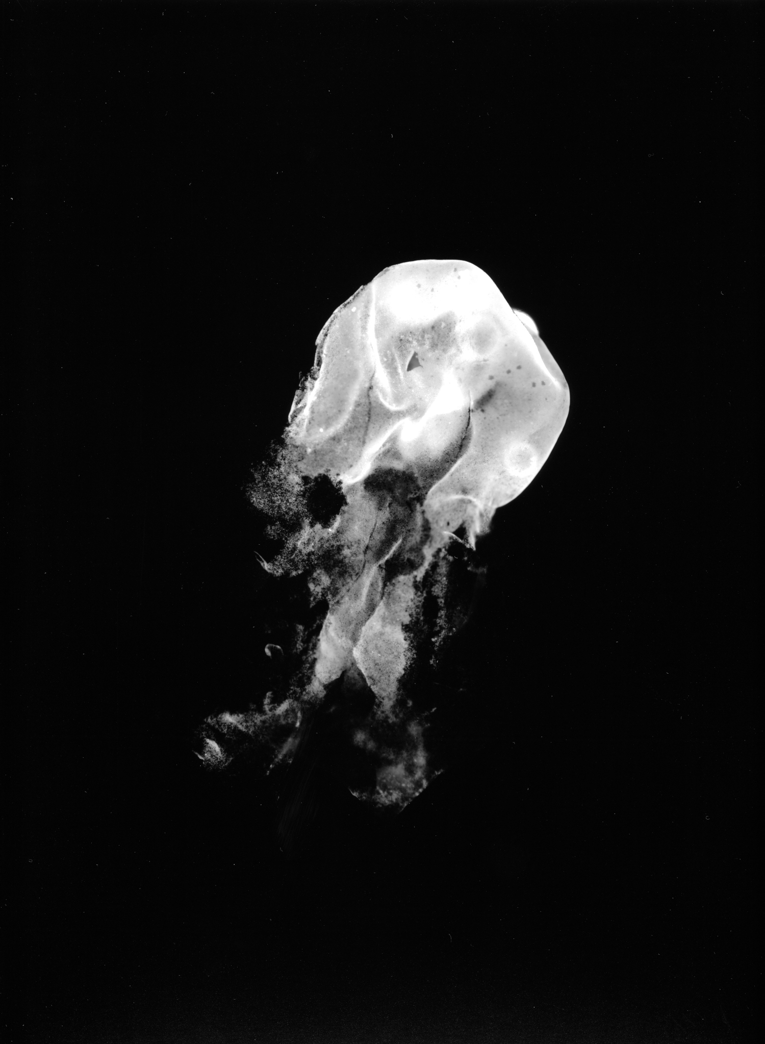 Dans le laboratoire photo de la Station que j’ai investi lors de mes sessions de travail, j’ai réalisé des tirages sans appareil de prise de vue. Les organismes translucides, placés sur la plaque de verre de l’agrandisseur, font office de négatifs, la lumière les traverse et les tirages réalisés sont à chaque fois uniques, impossible à reproduire. Avec pour matière première des créatures d’une taille parfois si infime qu’elle rend leur observation difficile, j’offre aux regards un monde qui bouscule les rapports d’échelle.